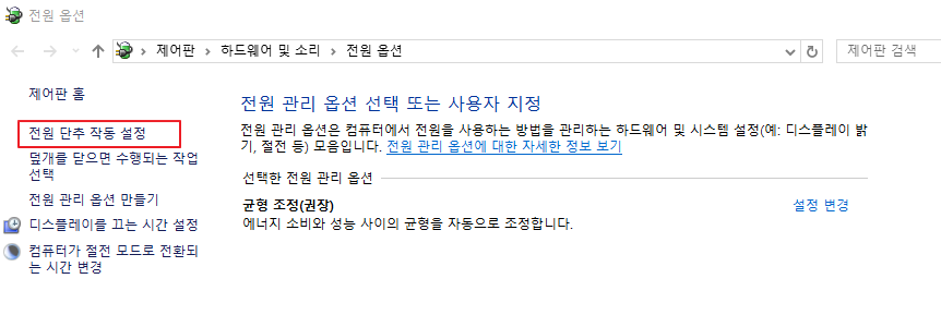 - 하이버네이션이 꺼져 있으면 빠른 시작 옵션이 보이지 않습니다.