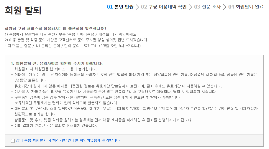 쿠팡 탈퇴를 진행하다 아래 항목 중 해당 되는 항목이 있으면 탈퇴가 제한될 수도 있습니다.